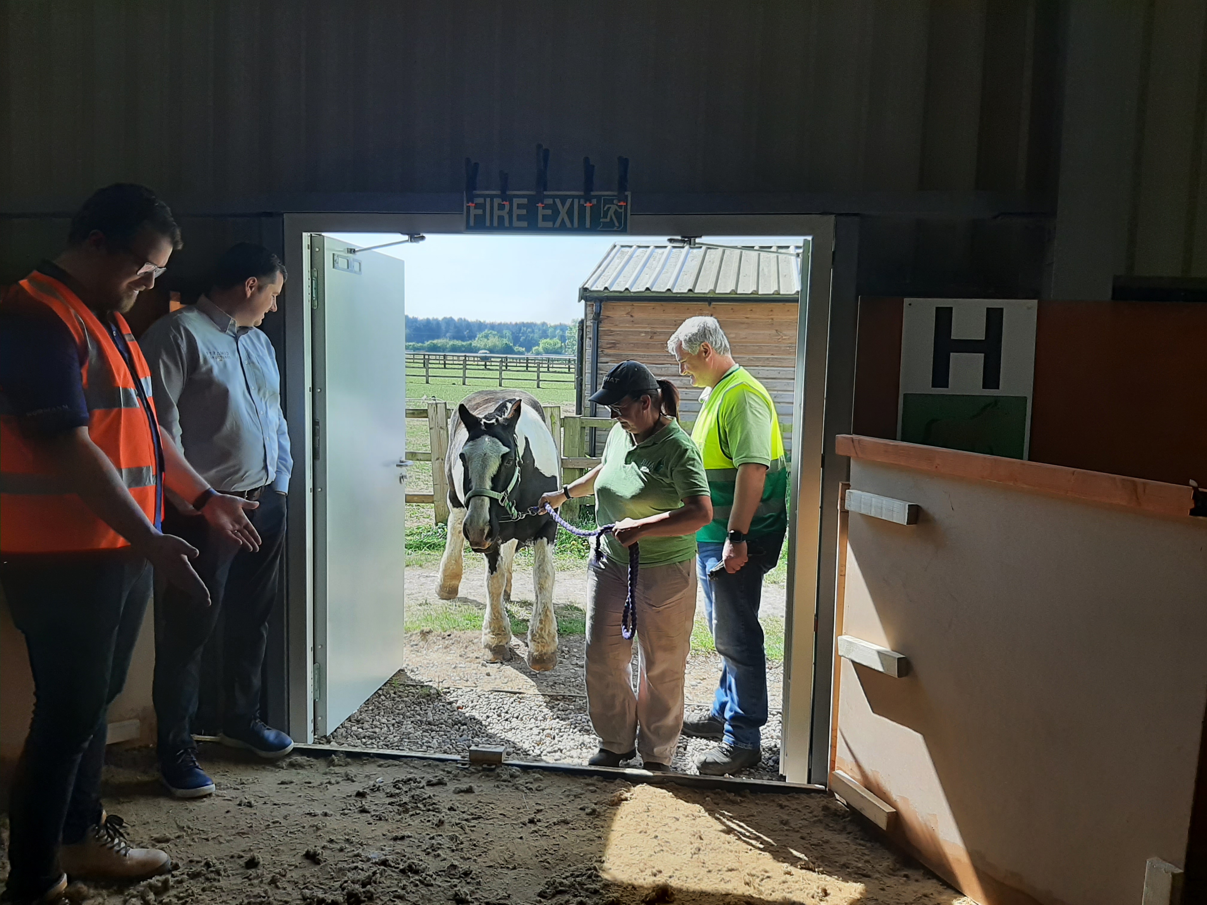 The arena gets very hot in the summer, and this door really helps with extra ventilation for our riders, coaches, volunteers and horses. It will also serve as another emergency exit should it ever be needed. Superstar Bob was more than happy to test it out.